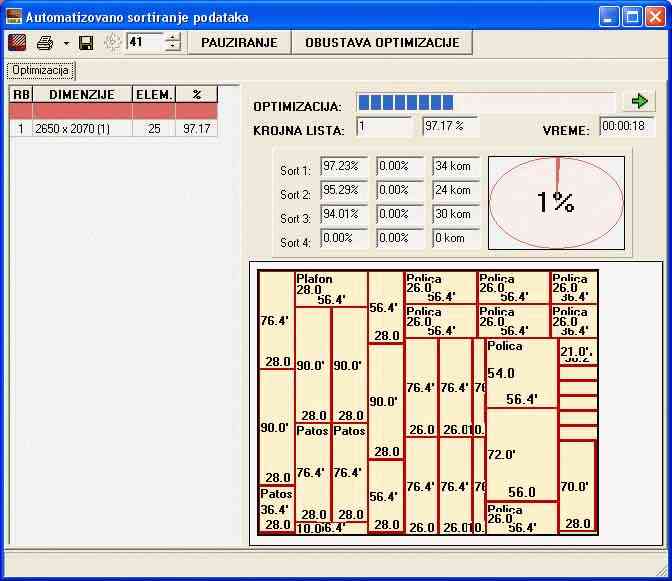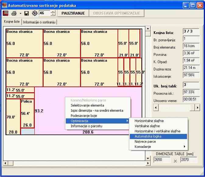 Program služi za optimalno uklapanje pravougaonih površina u pravougaonu površinu. Funkcionalnosti programa: